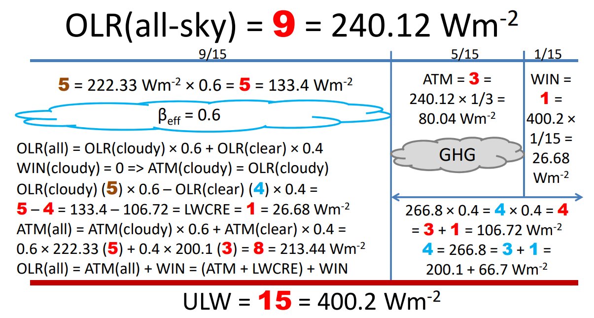 As we have seen, the planetary emissivity (the ratio between the LW radiation to space at the upper boundary and the LW radiation from the lower boundary), called also as the all-sky transfer function f(all) = OLR(all)/ULW, according to IPCC AR6 Fig. 7.2 is 239/398 = 0.6005, while its theoretical value is 9/15 = 0.6. Its equivalence to the effective cloud area fraction guarrantees that the upward LW emission from the cloud-covered part of the surface provides the energetic content of the outgoing LW radiation at TOA: