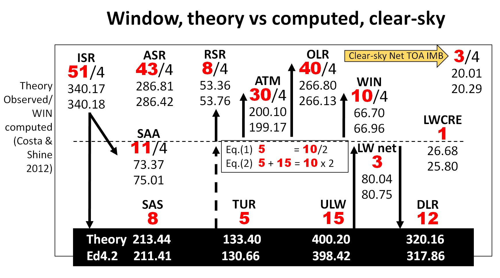 Costa and Shine (2012) performed LBL-computation of the global mean clear-sky atmospheric window radiation (STI, surface transmitted irradiance, without assumption on the wavelengths), and found it as 65 Wm-2, with regard to their model-OLR = 259 Wm-2. With proportionality, using our theoretical OLR(clear) = 266.8 Wm-2, this would result in WIN(clear) = 66.96 Wm-2.